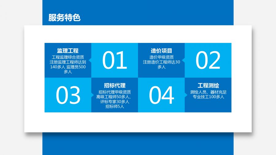 同創(chuàng)公司共完成代理項(xiàng)目的中標(biāo)金額約230億元。工程監(jiān)理和造價(jià)咨詢業(yè)務(wù)已涵蓋全部14個(gè)專業(yè)類別,提供監(jiān)理和造價(jià)咨詢服務(wù)的項(xiàng)目投資額達(dá)710億元。單個(gè)監(jiān)理項(xiàng)目總投資達(dá)26億元,監(jiān)理合同金額達(dá)2421萬元。在測繪、工程項(xiàng)目管理、全過程咨詢等領(lǐng)域均已涉及。四川同創(chuàng)建設(shè)工程管理有限公司通過不懈的努力,緊跟著國家與行業(yè)政策,茁壯成長,業(yè)務(wù)已邁上了穩(wěn)定的新臺(tái)階。